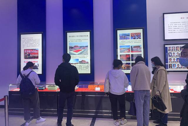 同学们在“我校为建国七十周年庆典做出的重要贡献”展区驻足观看。展墙上再现着北理师生在阅兵式上的精彩瞬间,展柜中陈列着北理师生参与阅兵的物品——衣服、花簇等。这些纪念品承载着如今北理的光辉历程,也将引导一代又一代莘莘学子不懈努力、创造更加辉煌的明天。