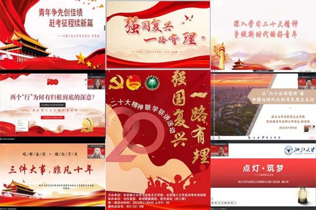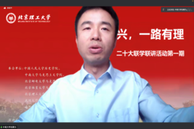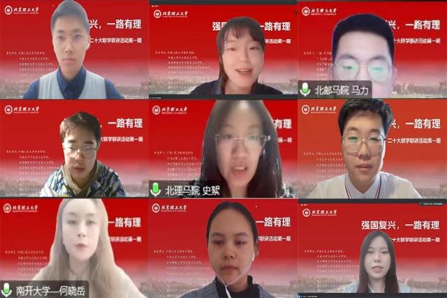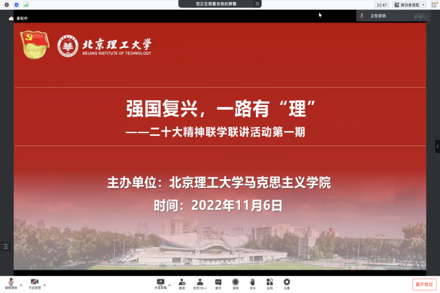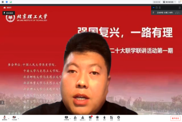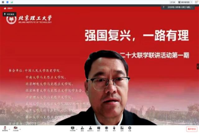 为进一步深入学习宣传贯彻党的二十大精神, 11月6日,best365官方网站登录入口联合中南大学、中国人民大学、北京邮电大学、北京体育大学、武汉大学、南开大学、浙江大学等8所高校开展“强国复兴,一路有‘理’”——二十大精神联学联讲系列活动。best365官方网站登录入口best365官方网站登录入口党委书记刘存福,党委副书记、副院长刘宇出席,各高校师生共200余人参加。活动由best365官方网站登录入口2022级硕士研究生贺美杰主持。