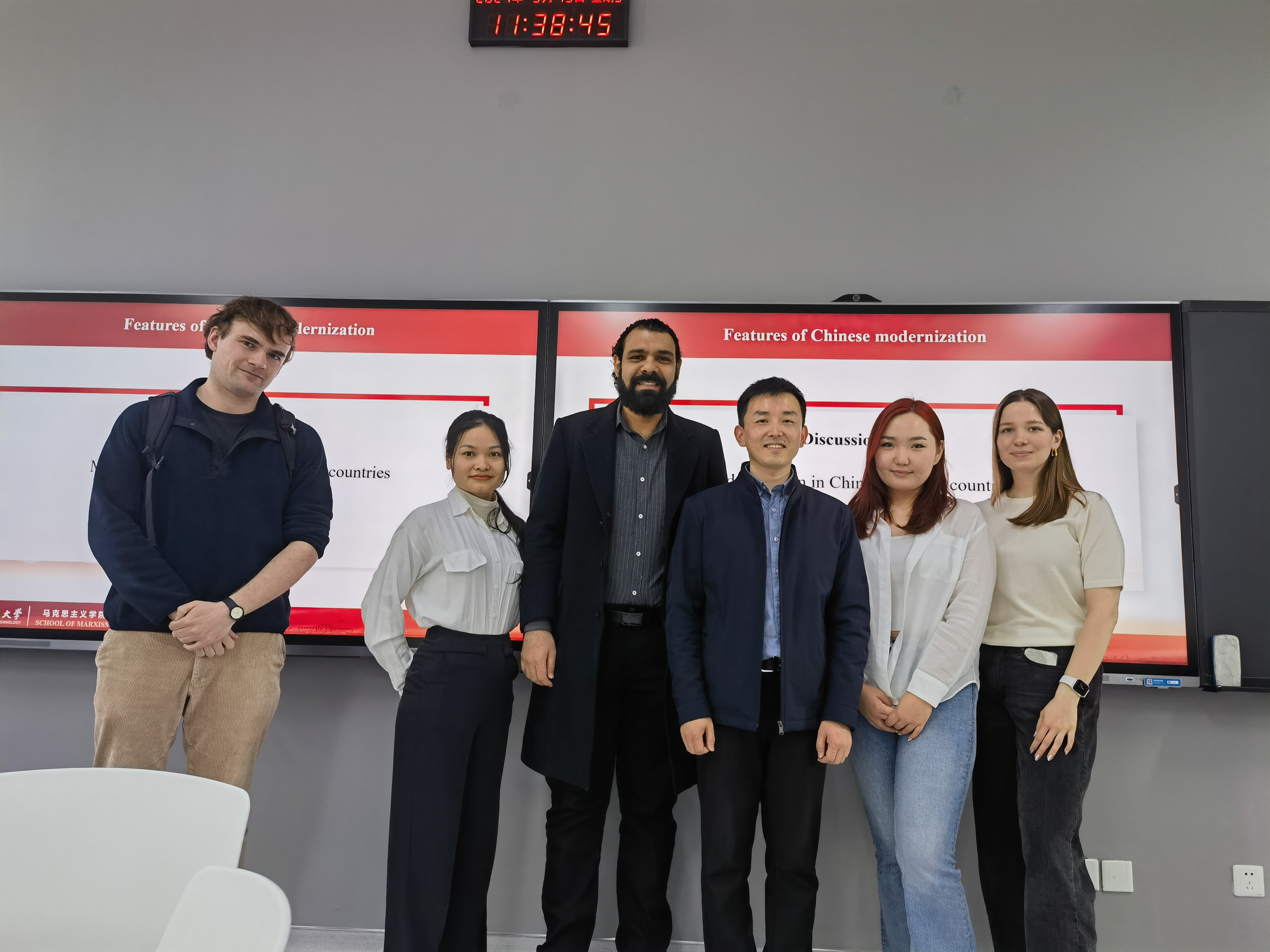 为进一步拓宽研究生的国际视野,增强其国际交流能力,3月15日上午文萃楼G224的“(英)中国化马克思主义理论”硕士研究生课堂迎来五位来自不同国家的留学生,与马克思主义理论专业的研究生们开展了一场别开生面的学术交流研讨。五位留学生分别是来自德国的何荣、蒙古国的海穗、埃及的卡穆、越南的胡芸和俄罗斯的丽娜,目前均在best365官方网站登录入口攻读研究生学位。本次课程由best365官方网站登录入口副院长、课程负责人江大伟教授主持。